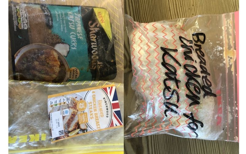 If it can be frozen – then do it! I freeze my bread, milk, sauces and bulk cooked soups and meals. Sliced bread can go straight into the toaster, or defrosted slice by slice when needed, and it does mean less waste. I found some breaded chicken (both homemade panko and ready made) yesterday, and a half open pack of Katsu sauce. I put these in a bag together so my family can make a chicken Katsu meal easily, as this is something they will eat and can make themselves. Frozen fruit and vegetables are your friends at times like this. If you can manage to buy them, then keep a packet in your freezer for when fresh are not available. I often buy soft fruit if it’s on offer and freeze this to use in porridge or smoothies. If frozen on day of purchase, it’s fine. There are lots of excellent products like frozen cauliflower cheese bake (Aldi and Lidl), leaf spinach (Waitrose and Tesco), Cauliflower rice (widely available) or steam fresh vegetables to discover.
